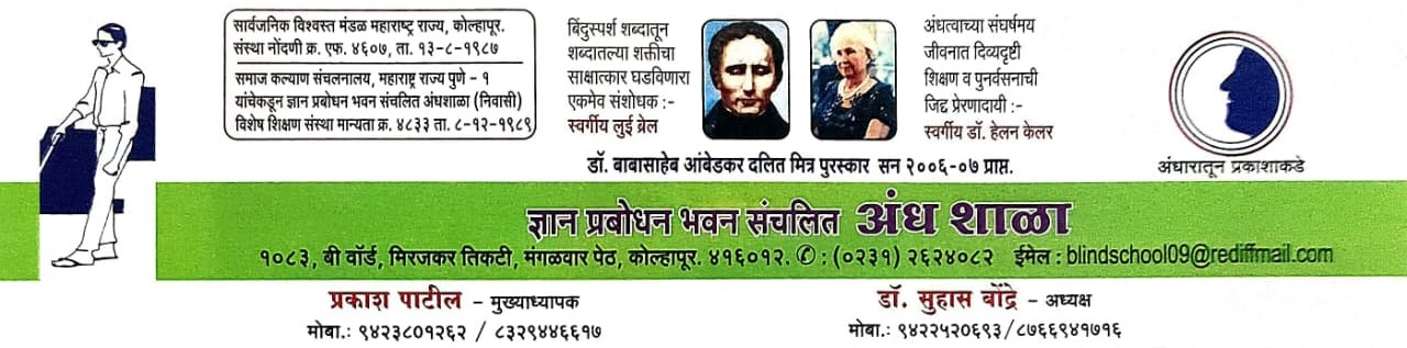 ज्ञान प्रबोधन भवन संचलित अंध शाळा, कोल्हापूर ही दृष्टिहीन मुलांच्या शिक्षण व सर्वांगीण विकासासाठी समर्पित शाळा आहे. आमच्या शाळेत विद्यार्थ्यांना आधार देणारे आणि प्रोत्साहनात्मक शिक्षण वातावरण उपलब्ध करून दिले जाते. प्राथमिक शिक्षण, वैयक्तिक लक्ष आणि विद्यार्थ्यांच्या सर्वांगीण विकासावर विशेष भर दिला जातो. आमचे ध्येय मुलांना आत्मविश्वासू, स्वावलंबी आणि समाजातील सक्षम नागरिक बनवणे आहे.